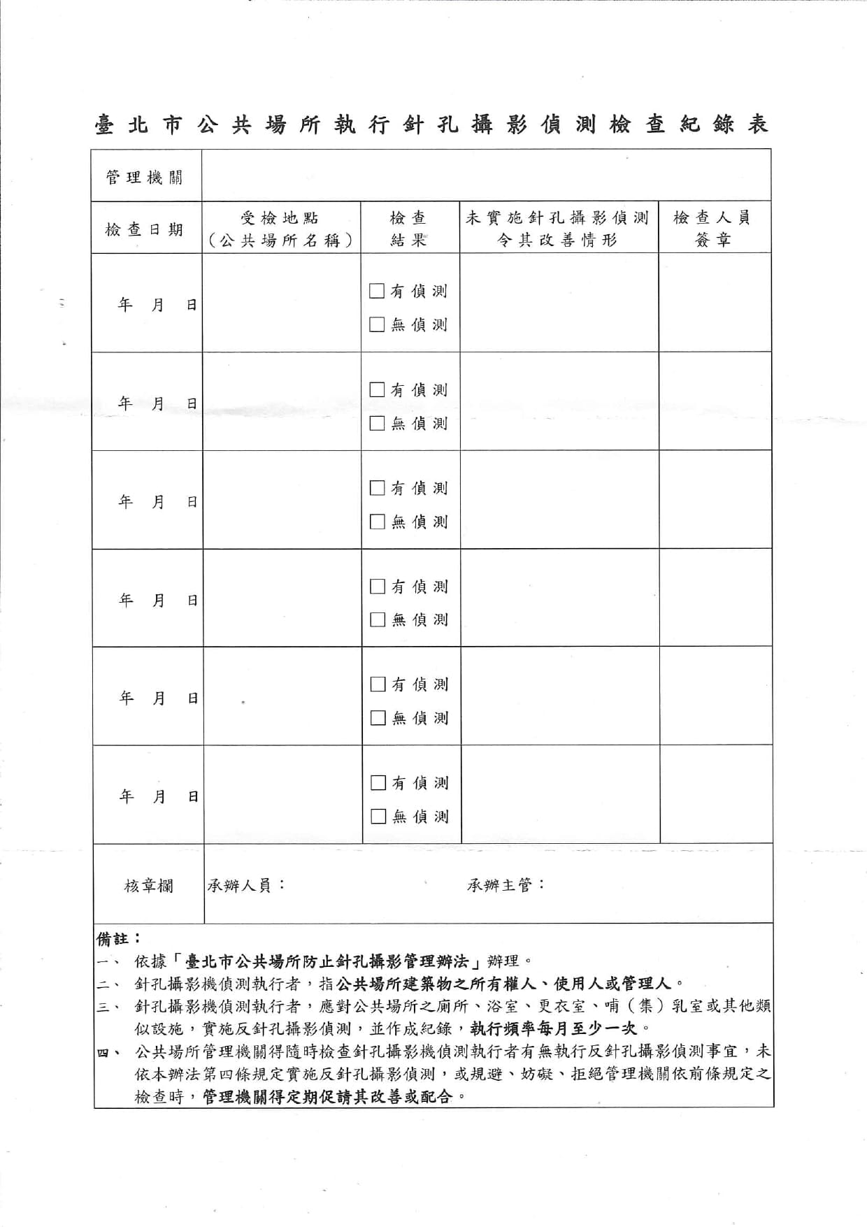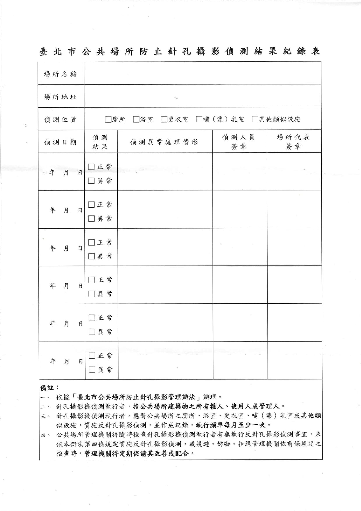 114044-114.06.12-(生)-落實臺北市公共場所防止針孔攝影管理辦法-配合辦理針孔攝影偵測作業函_page-0001.jpg114044-114.06.12-(生)-落實臺北市公共場所防止針孔攝影管理辦法-配合辦理針孔攝影偵測作業函_page-0002.jpg114044-114.06.12-(生)-落實臺北市公共場所防止針孔攝影管理辦法-配合辦理針孔攝影偵測作業函_page-0003.jpg114044-114.06.12-(生)-落實臺北市公共場所防止針孔攝影管理辦法-配合辦理針孔攝影偵測作業函_page-0004.jpg114044-114.06.12-(生)-落實臺北市公共場所防止針孔攝影管理辦法-配合辦理針孔攝影偵測作業函_page-0005.jpg114044-114.06.12-(生)-落實臺北市公共場所防止針孔攝影管理辦法-配合辦理針孔攝影偵測作業函_page-0006.jpg114044-114.06.12-(生)-落實臺北市公共場所防止針孔攝影管理辦法-配合辦理針孔攝影偵測作業函_page-0007.jpg