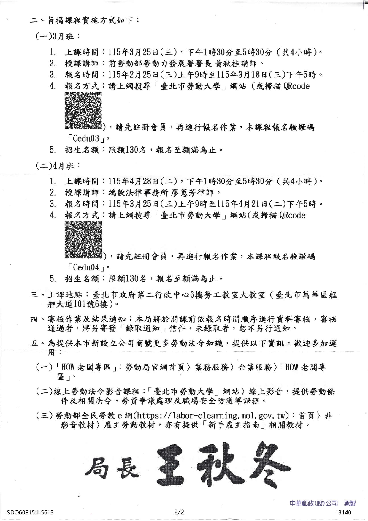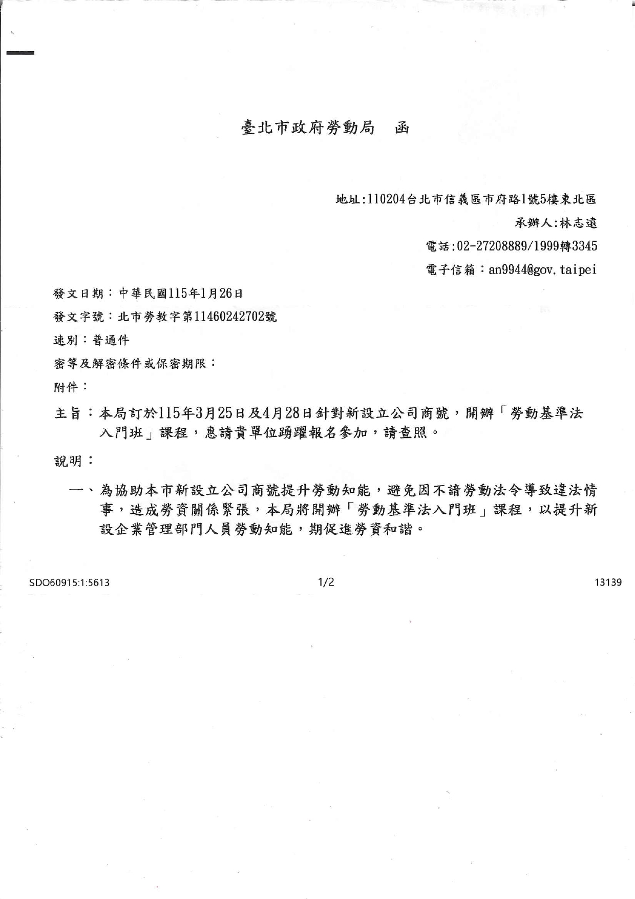 【訊息通知】臺北市政府勞動局開辦「勞動基準法入門班」課程(115年 3/25、4/28)
